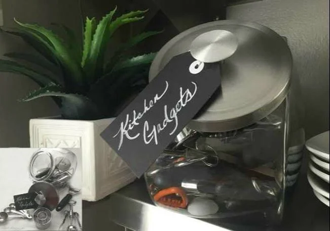 If you have a small kitchen like I do, there may not be enough drawers to place everything. My work-around is to use a cookie jar for those small annoying kitchen gadgets that take up precious space inside the drawer. Potato peelers, measuring spoons, tongs, cookie cutters, etc all go inside the jar.