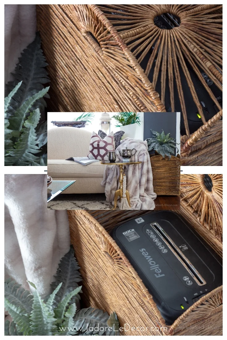 There will be a bit of bit of overlap here. In this post we addressed the common entryway problem of what to do with the mail. But since my entryway really is in my living room I mentioned this during living room organization week. For those who missed it here it is again. The photo below shows how we hide a shredder in a hamper to tackle the problem of junk mail. I can’t even begin to tell you what a game changer this has been!